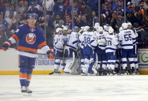The Lightning celebrated while Islanders goalie Thomas Greiss (36