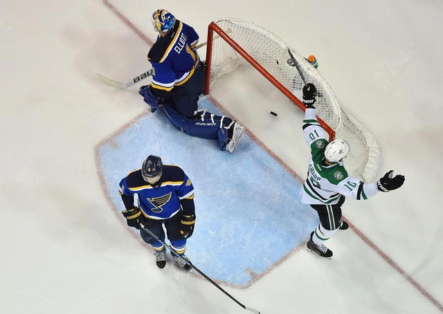 Faksa in front of the St. Louis net, and he didn't miss.