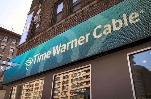 A Time Warner Cable sign and logo are seen on the