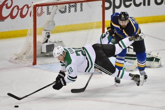Blues center Patrik Berglund (21) knocks Dallas Stars center