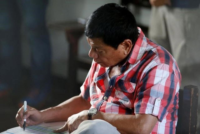 Presidential candidate Rodrigo "Digong" Duterte casts his vote at a
