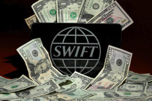 The SWIFT logo is pictured in this photo illustration taken April 26,