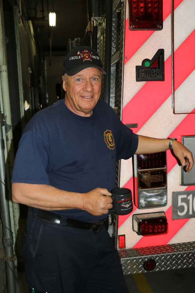 [May 10, 2016]   LINCOLN - Larry Spurling strikes a pose on his last day on the job with the Lincoln Fire Department. Spurling commented "leaning on a fire truck with a cup of coffee" was something he was known for at the fire department. The only thing missing he said “is a sandwich in the other hand.” Spurling spent 29 and 1/2 years with the Lincoln Fire Department and officially retired on April 23, 2016.