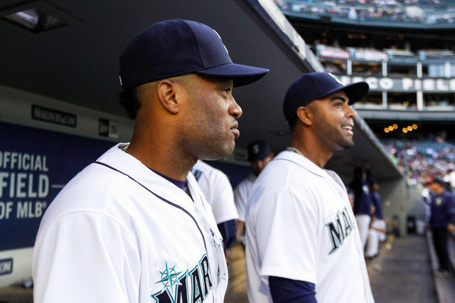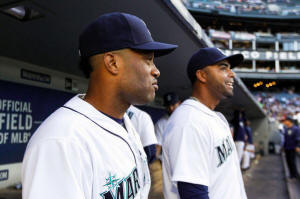 Mariners second baseman Robinson Cano (22, left) and right fielder