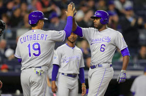 Royals center fielder Lorenzo Cain (6) high fives third baseman Cheslor