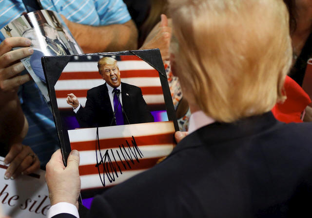 Donald Trump signs autographs at the end of a campaign rally in Eugene,