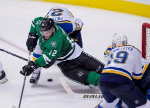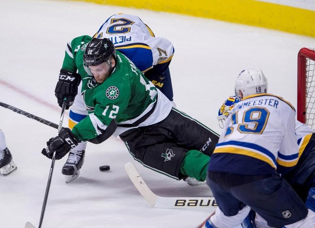 Blues defenseman Alex Pietrangelo (27) checks Dallas Stars center Radek