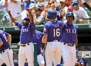 Rangers left fielder Ryan Rua (16) celebrates with Texas Rangers third