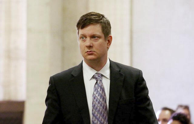 Chicago police Officer Jason Van Dyke approaches the bench during his