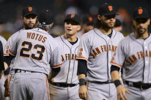 Giants second baseman Joe Panik (12) celebrates with coaches and