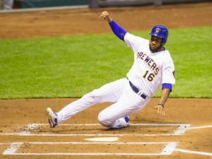 Brewers right fielder Domingo Santana (16) scores a run during the first