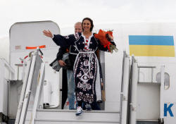 Greeted by singing and cheering fans on her arrival in Kiev on