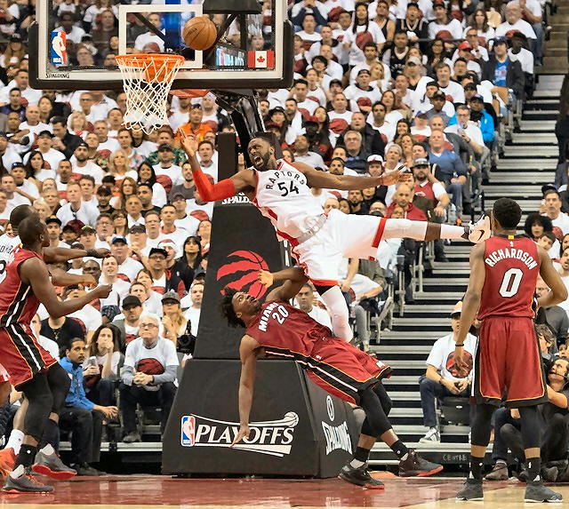 Raptors forward Patrick Patterson (54) drives to the basket as Miami
