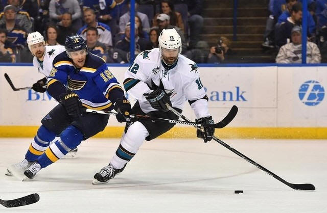 Blues center Jori Lehtera (12) reaches for the puck on San Jose Sharks