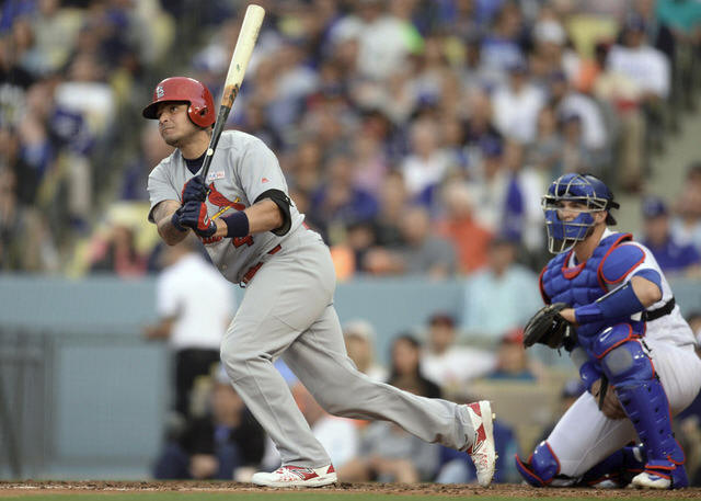 Cardinals Yadier Molina (4) hits a pinch hit double in the 7th inning to