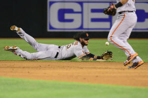 Giants infielder Brandon Crawford (35) dives for a ball in the fifth