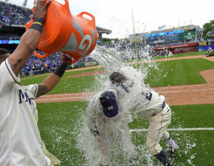 Pedro Grifol (28) his interpreter are doused by catcher Salvador