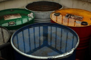 Used oil barrels are seen outside a garage in Cuevas del Becerro, near