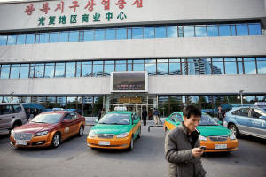 Taxis are parked outside a department store in central Pyongyang, North