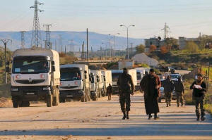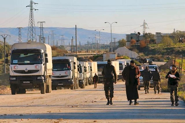 Rebel fighters walk past a Syrian Arab Red Crescent aid convoy heading