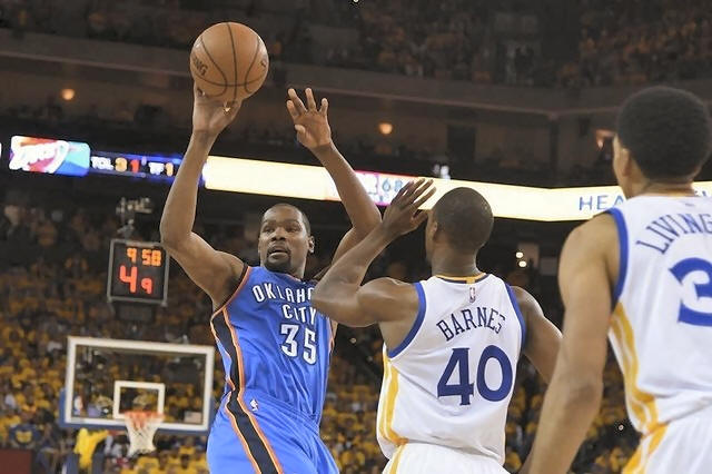 Thunder forward Kevin Durant (35) passes he basketball against Golden