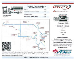All buses are equipped for ADA accessibility. The new deviated fixed route is very convenient for those who utilize public transportation to go to work, shop, or attend medical appointments. For current schedule updates, information, or to schedule a deviation to the route please call LMPT at 1-866-930-8212. If you have any questions in regards to the new program you may contact CAPCIL's Transportation Director, DiAnne Turner at 217-732-2159 ext 242, or you may contact the Logan County Board at (217) 732-6400.