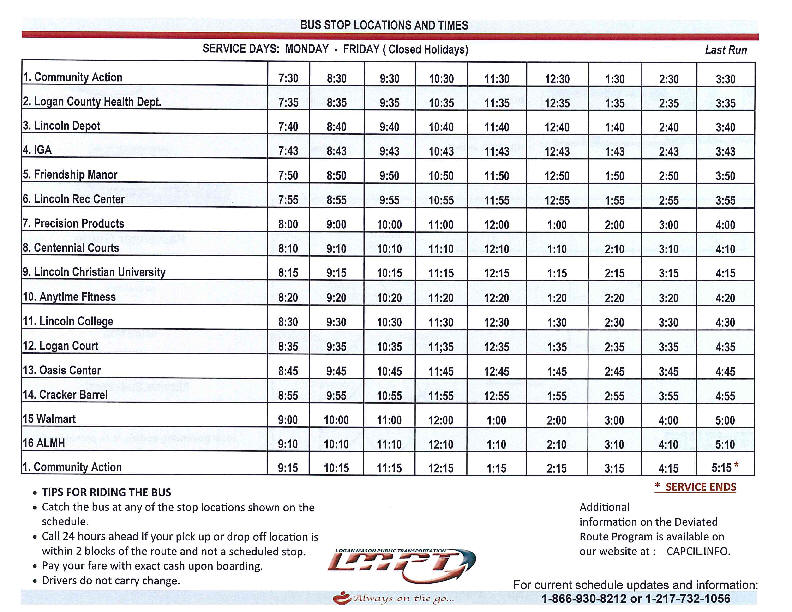 The new deviated fixed route will be stopping at the following locations in the order that follows: CAPCIL, Logan County Health Department, Lincoln Depot, IGA, Friendship Manor, Lincoln Park District Recreation Center, Precision Products, Centennial Courts, Lincoln Christian University, Anytime Fitness, Lincoln College, the Oasis Senior Center, Cracker Barrel, Walmart, Abraham Lincoln Memorial Hospital, and CAPCIL. Printed bus schedules are available as well as online and mobile access. If you would like to view the route online, visit the CAPCIL website at www.capcil.info/transportation­ department.html
