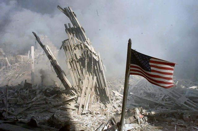 An American flag flies near the base of the destroyed World Trade Center