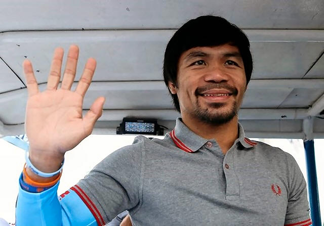 Filipino boxer and Senatorial candidate Manny Pacquiao, waves from a
