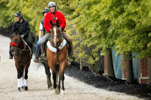 Kentucky Derby winner Nyquist (L) is walked to the track prior to a