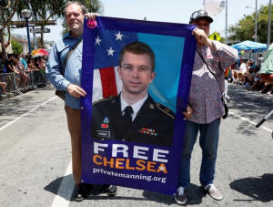 Men carry a sign urging freedom for convicted national security leaker