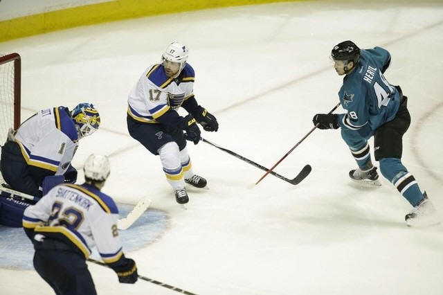 Sharks center Tomas Hertl (48) scores a goal against St. Louis Blues