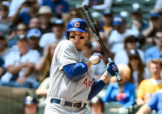 Cubs first baseman Anthony Rizzo (44) backs away from an inside pitch in