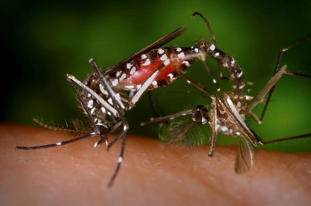 A pair of Aedes albopictus mosquitoes are seen during a mating ritual