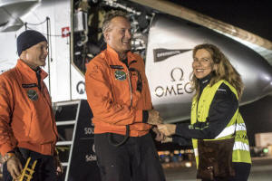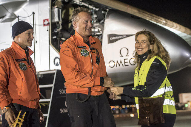and alternate pilot Bertrand Piccard after landing Solar Impulse 2 (Si2)