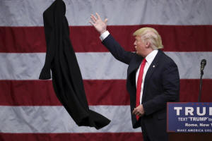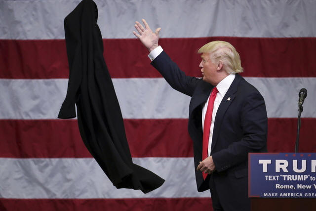 candidate Donald Trump tosses off his overcoat as he speaks at a
