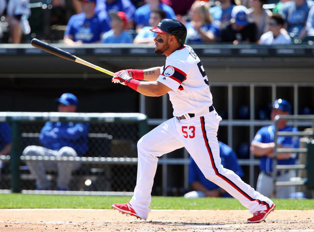 White Sox outfielder Melky Cabrera (53) hits a double against the Kansas
