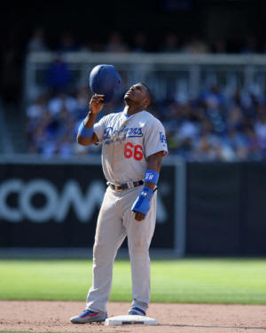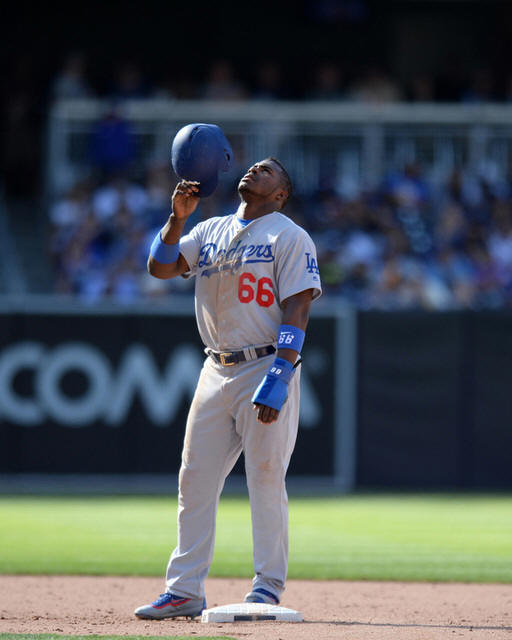 Dodgers right fielder Yasiel Puig (66) reacts on second after a base