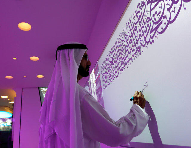 UAE and Ruler of Dubai, signs on the board during the official