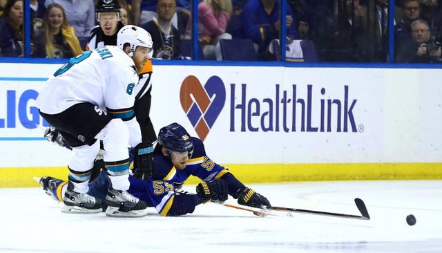 Sharks center Joe Pavelski (8) and St. Louis Blues defenseman