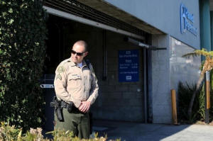 A Sheriffs deputy stands watch outside the opening of a new Planned