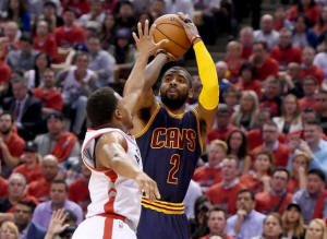 Cavaliers guard Kyrie Irving (2) takes a shot over the outstretched arm