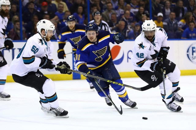 Sharks right wing Joel Ward (42) and St. Louis Blues right wing Vladimir