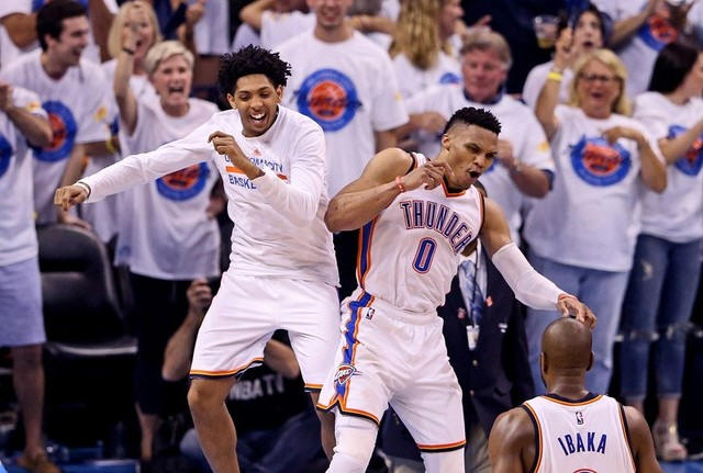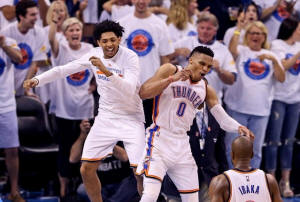 Thunder guard Russell Westbrook (0) and guard Cameron Payne (left)