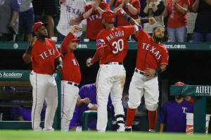 Rangers right fielder Nomar Mazara (30) is congratulated after