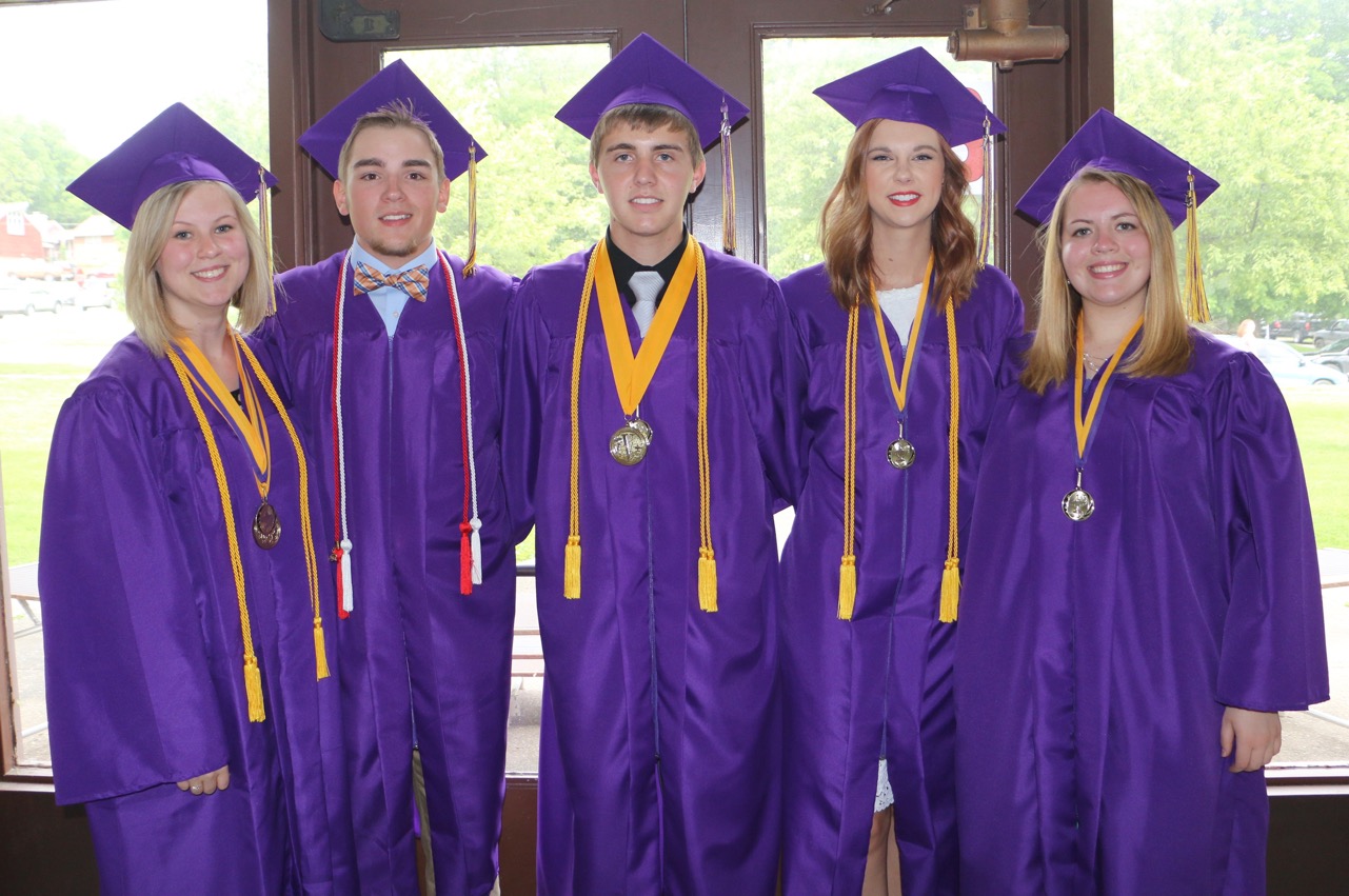 The five students who entertained the crowd with speeches at the 104th Annual Commencement at Mount Pulaski High School on Saturday, May 21, 2016. Left to right: Salutatorian Elizabeth Siebert, Class President Sam Koehl, Valedictorian Brian Batchelder, Closing Remarks speaker Lizzie Ford and Opening Remarks speaker Miranda Hilliard.