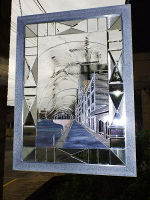 To finish the work, each picture is framed in a wooden frame. On Friday evening, he pointed out a couple of pieces, in particular, noting that they were tree cut pieces of wood, with the bark still along the edges.