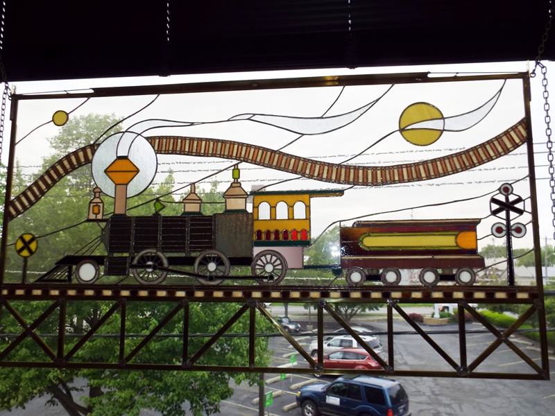 Other notable pieces included the old fashioned steam locomotive that was hanging on the second floor. The piece shows the train crossing a truss bridge with smoke blowing from its stack. What is fascinating about this piece, as well as several others, is the fact that it is made up of several hundred tiny pieces of glass, all carefully put together to create a picture.