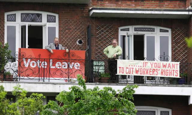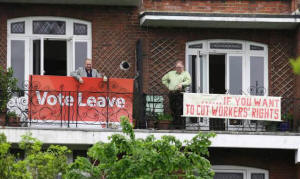 large "Vote Leave" banner appearing on the balcony next door, a
