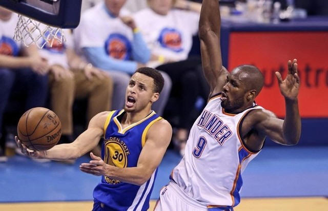 Warriors guard Stephen Curry (30) shoots past Oklahoma City Thunder